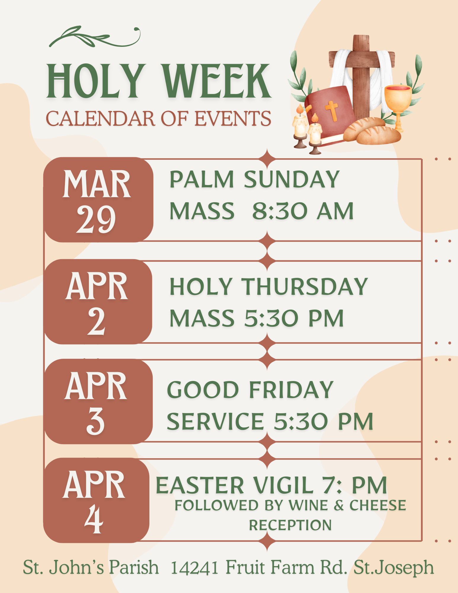 Masses: Sundays and Wednesdays at 8:30am at St. John's Parish Center: 14241 Fruit Farm Rd. St. Joseph, MN