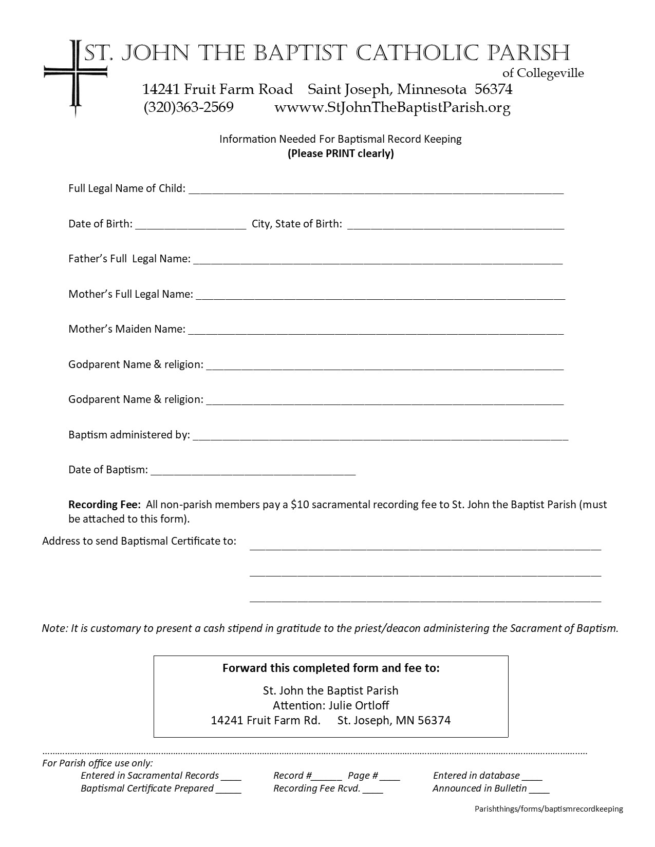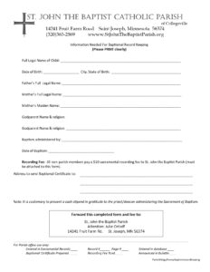 We welcome all Christians to celebrate the sacrament of Baptism. As our parish is continuing to grow, we ask that you prayerfully consider joining us. Whether celebrating a child or an adult baptism, it is our joy to share in this sacrament with you and your family. For more information please email Julie at jortloff@csbsju.edu or start by filling out the following: